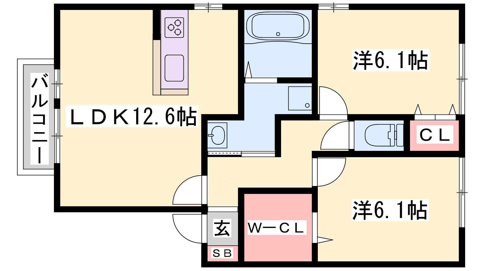 - LDK12.6帖、洋室6.1帖、洋室6.1帖