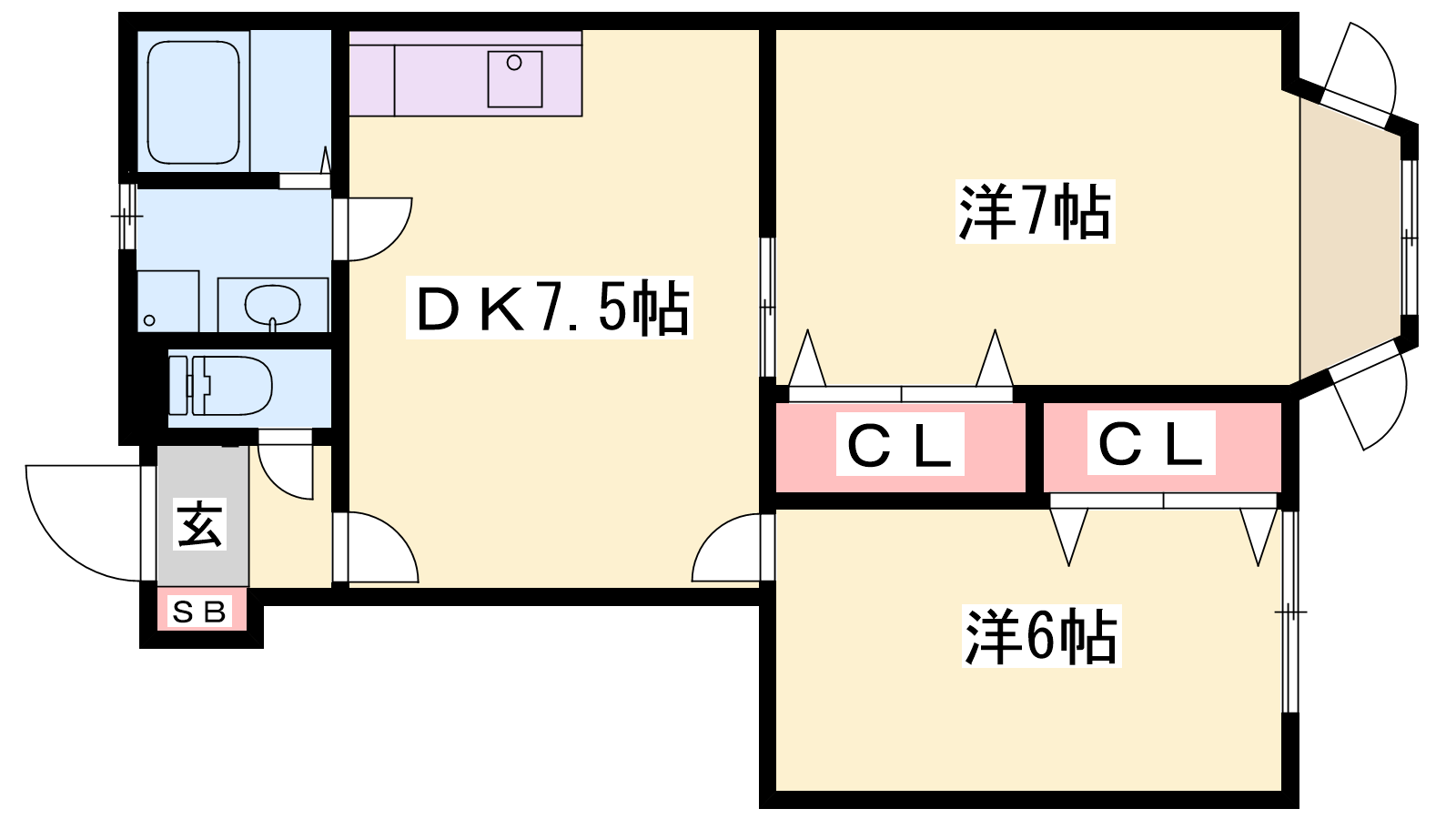 - DK7.5帖、洋室7帖、洋室6帖