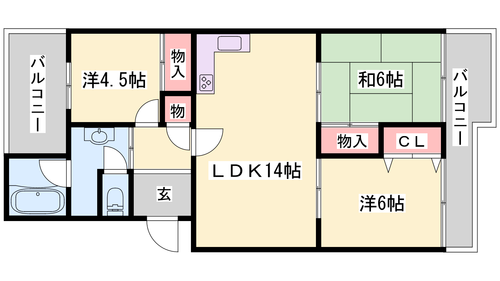 - LDK14帖、洋室6帖、洋室4.5帖、和室6帖