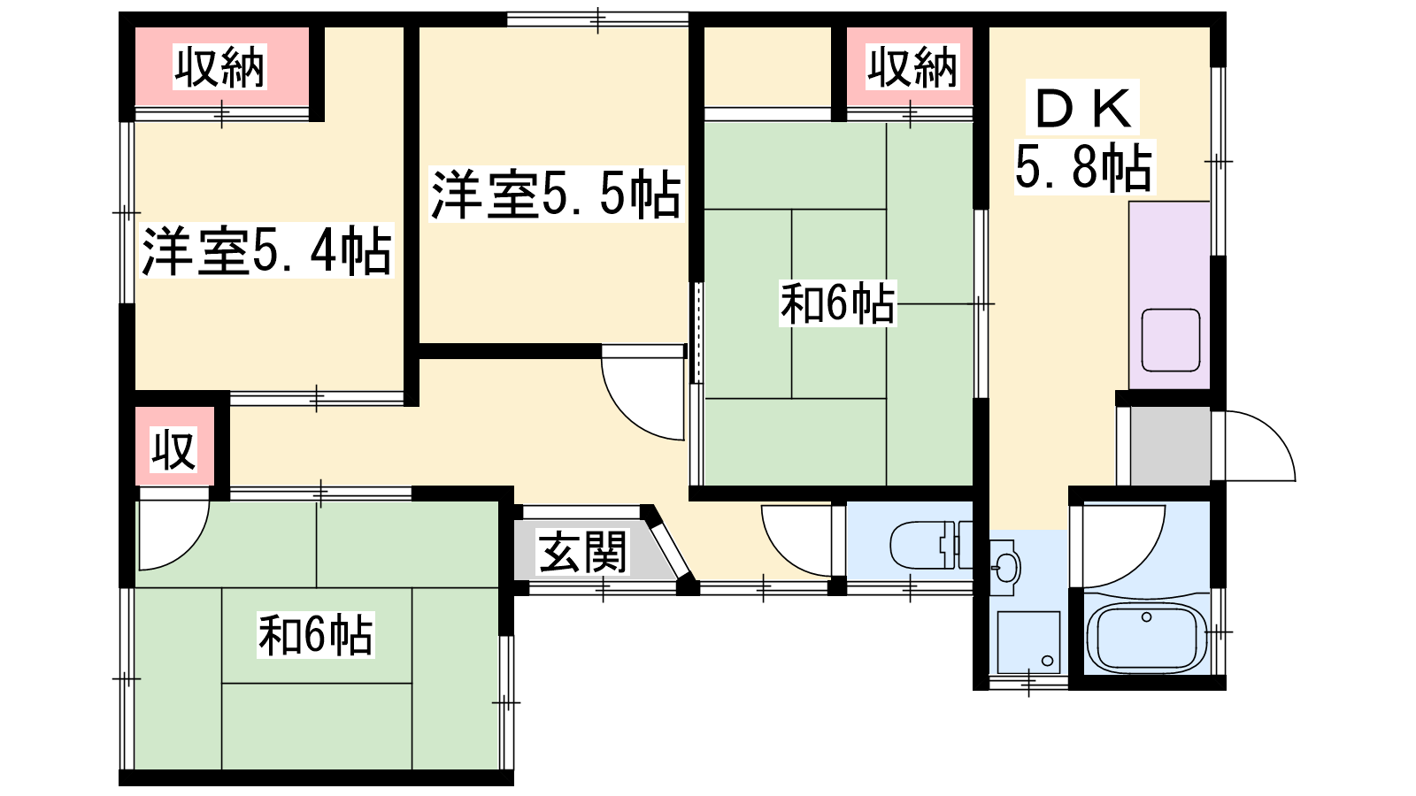 - DK5.8帖、洋室5.5帖、洋室5.4帖、和室6帖、和室6帖