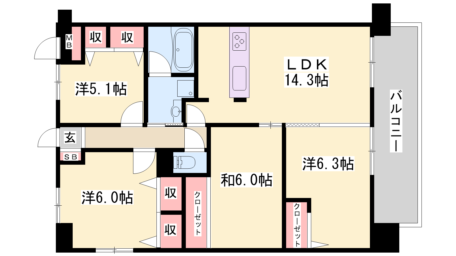 - LDK14.3帖、洋室6.3帖、洋室6帖、和室6帖、洋室5.1帖