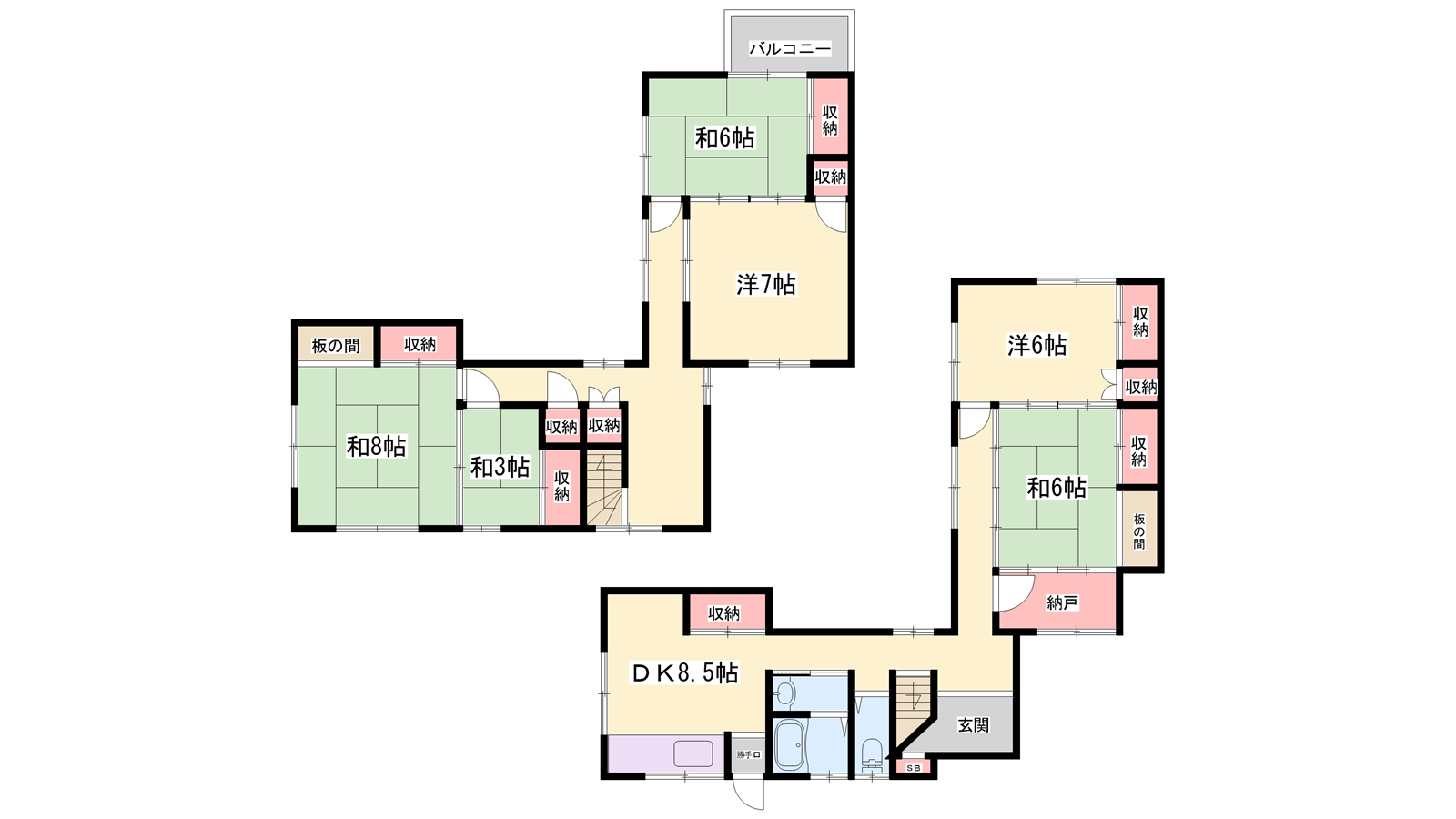- DK8.5帖、洋室7帖、洋室6帖、和室8帖、和室6帖、和室6帖、和室3帖