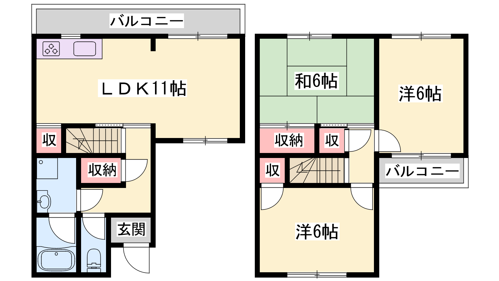 - LDK11帖、洋室6帖、洋室6帖、和室6帖