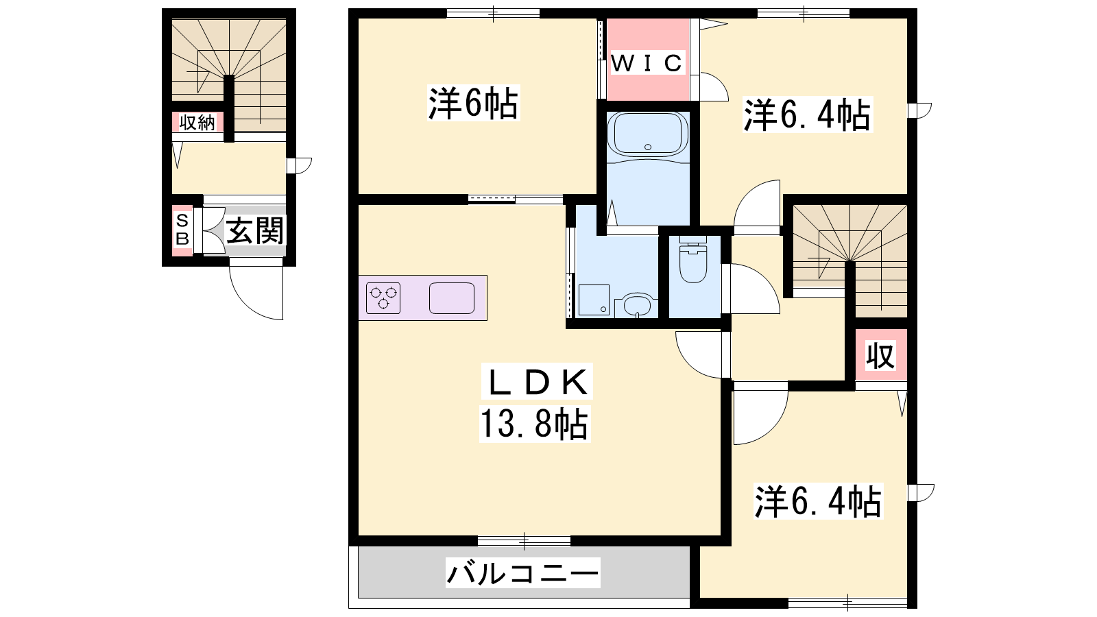 - LDK13.8帖、洋室6.4帖、洋室6.4帖、洋室6帖