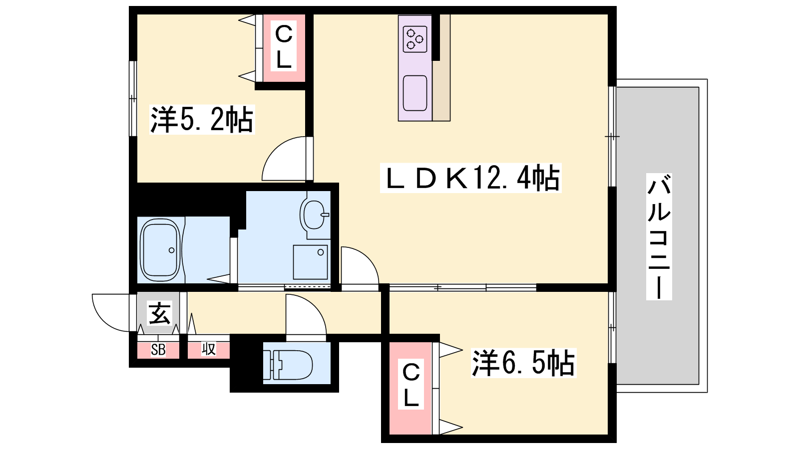 - LDK12.4帖、洋室6.5帖、洋室5.2帖