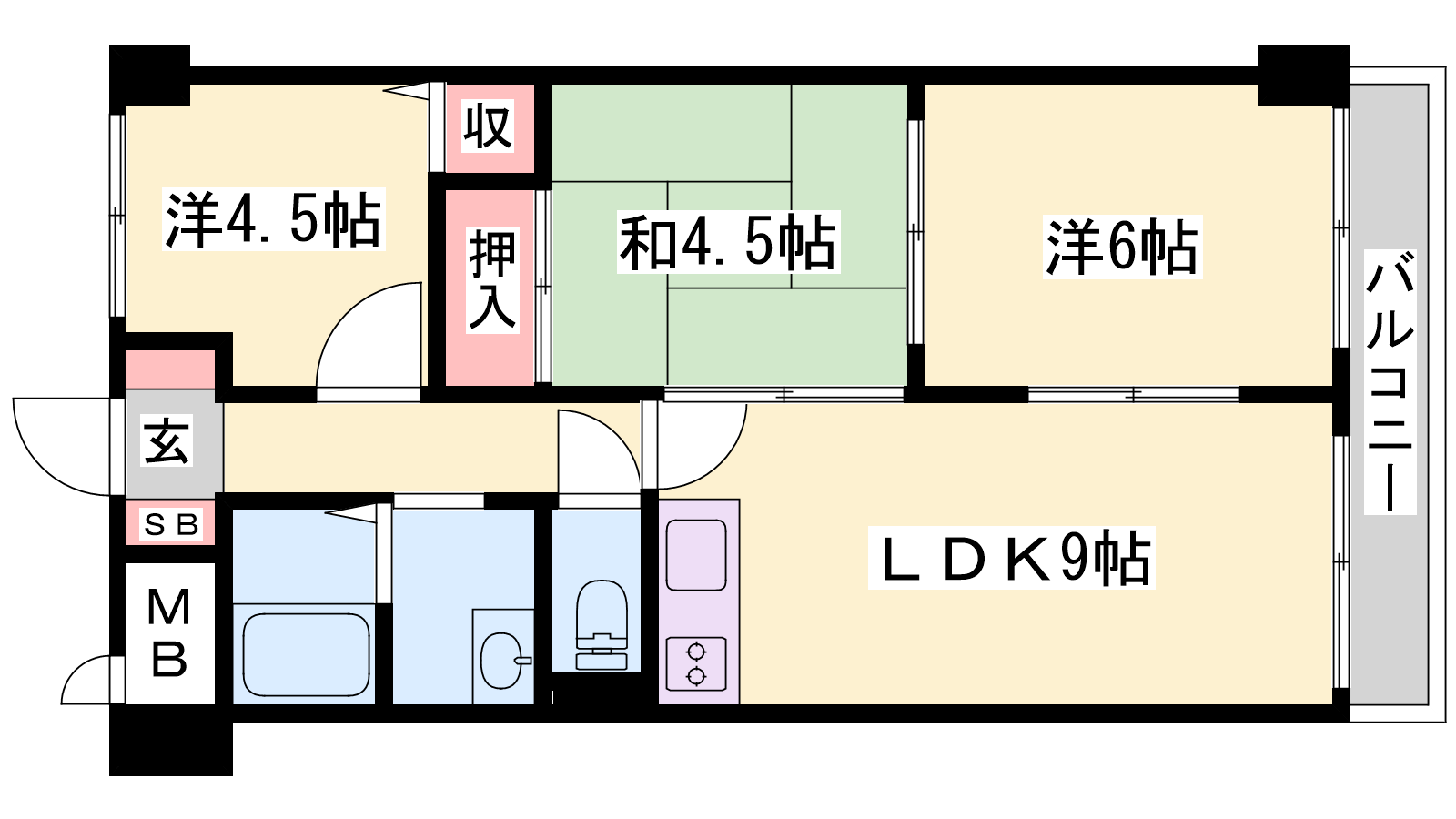 - LDK9帖、洋室6帖、洋室4.5帖、和室4.5帖