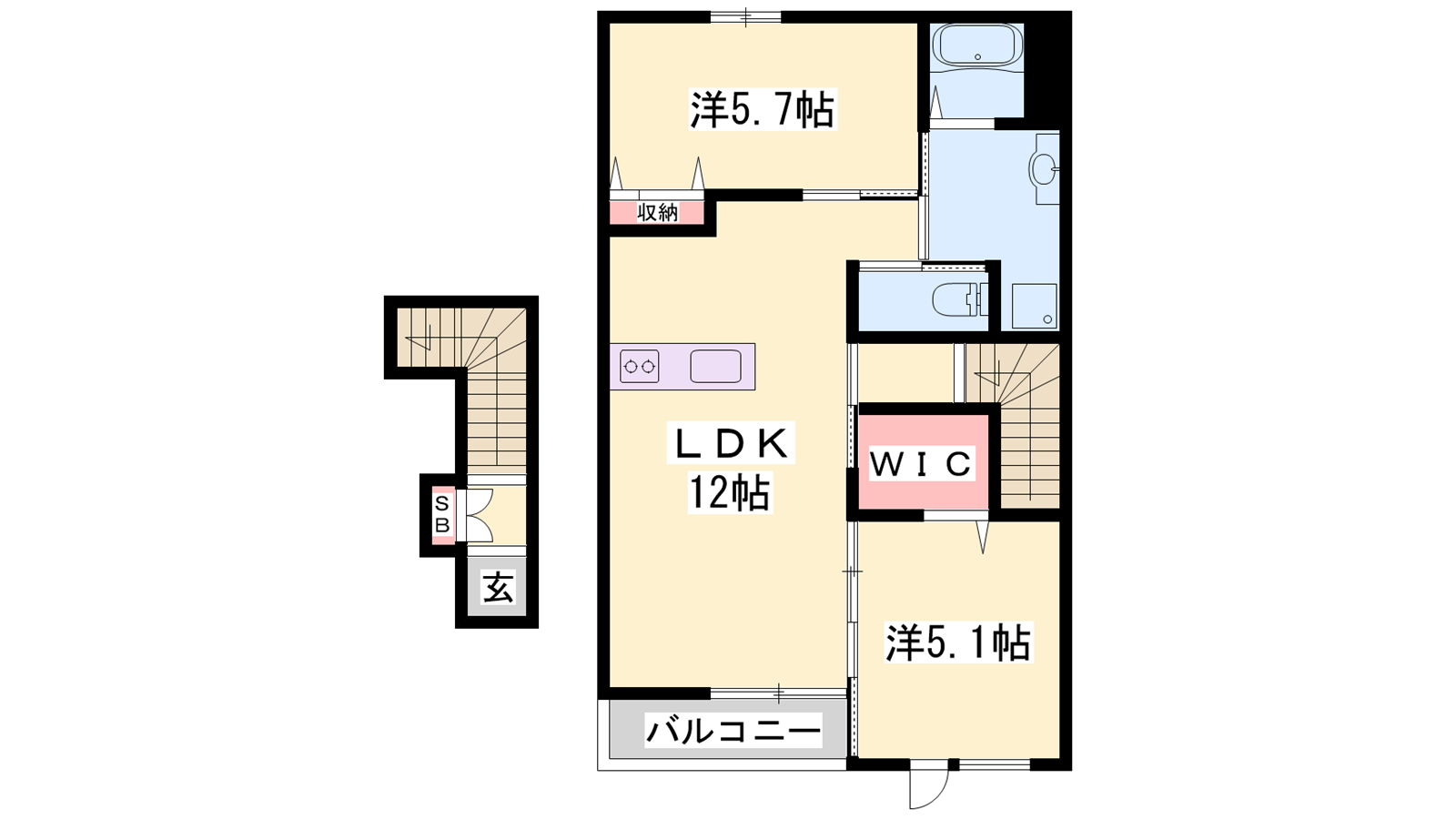 - LDK12帖、洋室5.7帖、洋室5.1帖