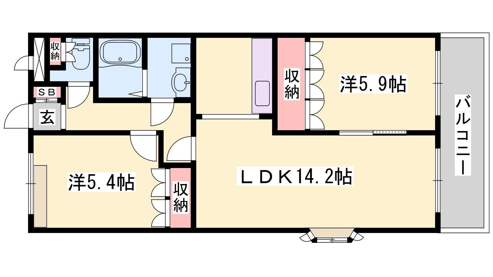 - LDK14.2帖、洋室5.9帖、洋室5.4帖