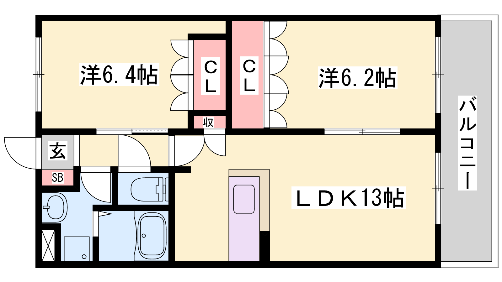 - LDK13帖、洋室6.4帖、洋室6.2帖