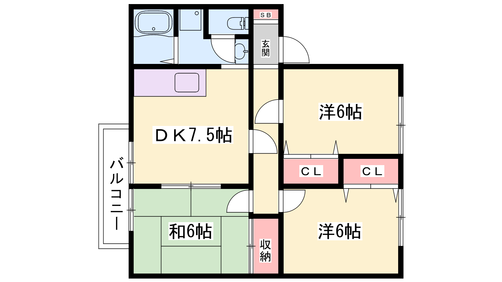 - DK7.5帖、洋室6帖、洋室6帖、和室6帖