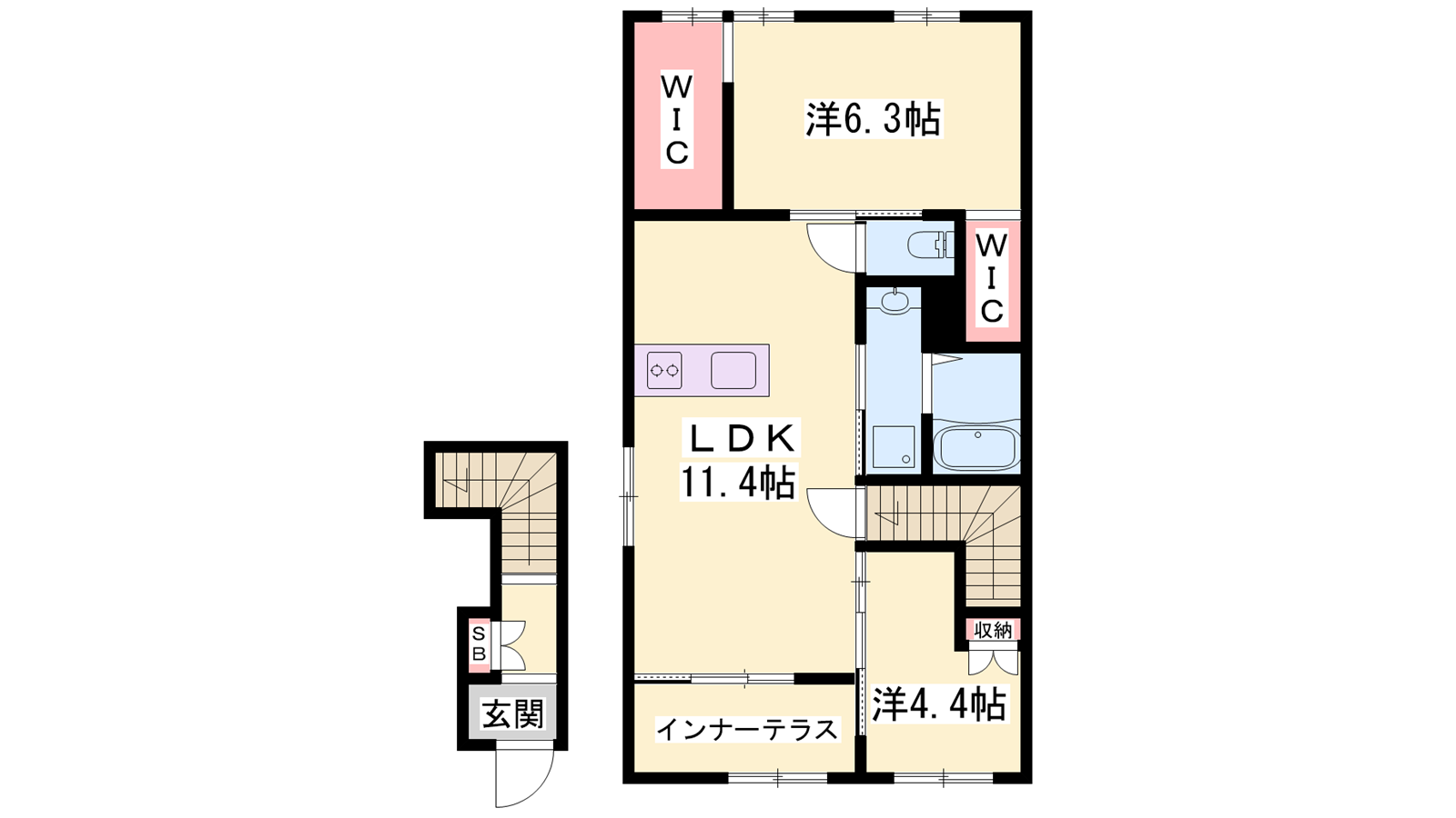 - LDK11.4帖、洋室6.3帖、洋室4.4帖