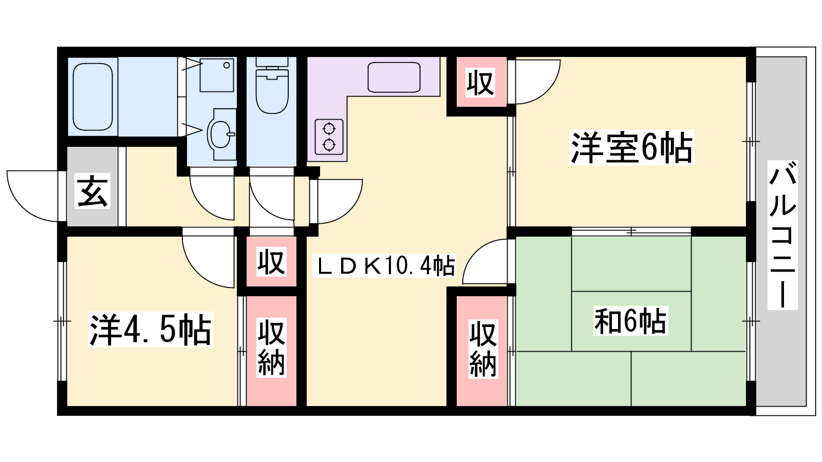 - LDK10.4帖、洋室4.5帖、和室6帖、和室6帖