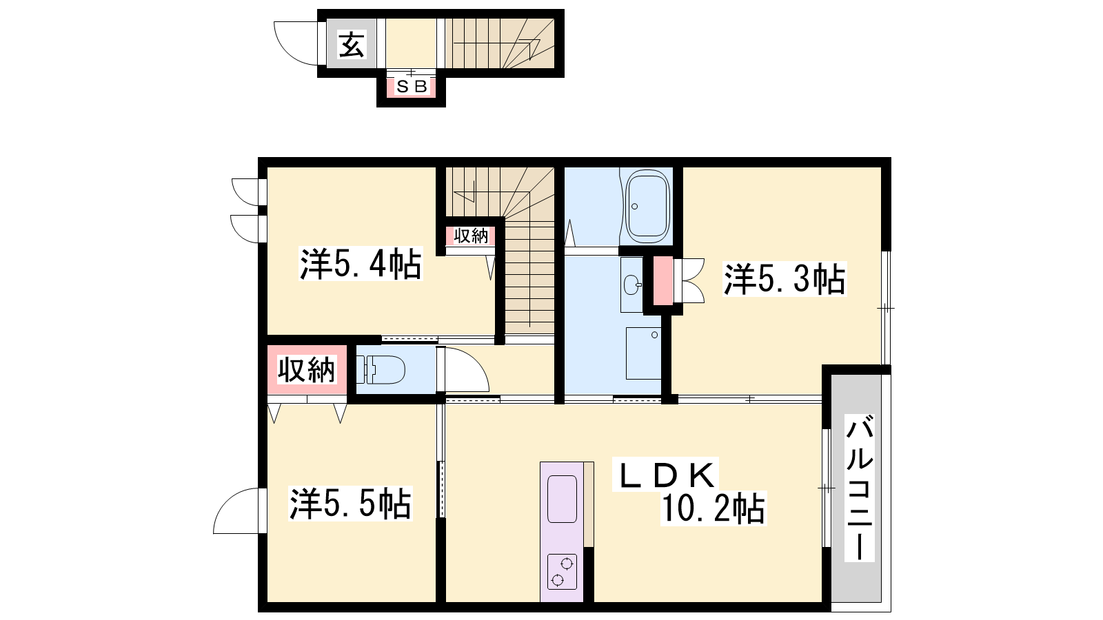 - LDK10.2帖、洋室5.5帖、洋室5.4帖、洋室5.3帖