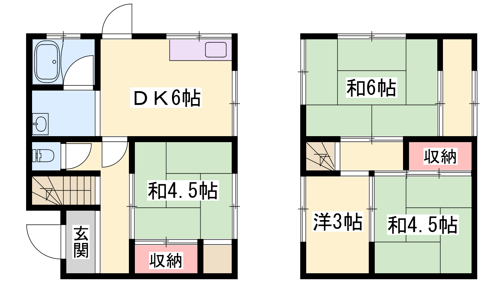 - DK6帖、和室4.5帖、和室6帖、和室4.5帖、洋室3帖