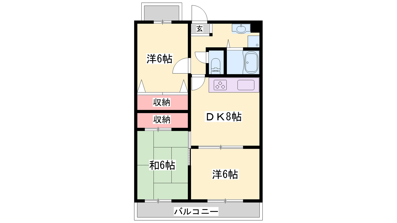 - DK8帖、洋室6帖、洋室6帖、和室6帖