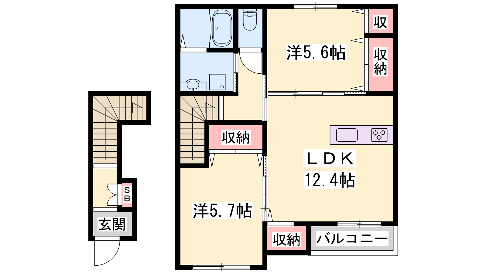 - LDK12.4帖、洋室5.7帖、洋室5.6帖
