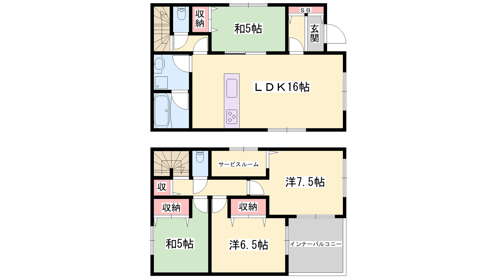 - LDK16帖、洋室7.5帖、洋室6.5帖、和室5帖、和室5帖