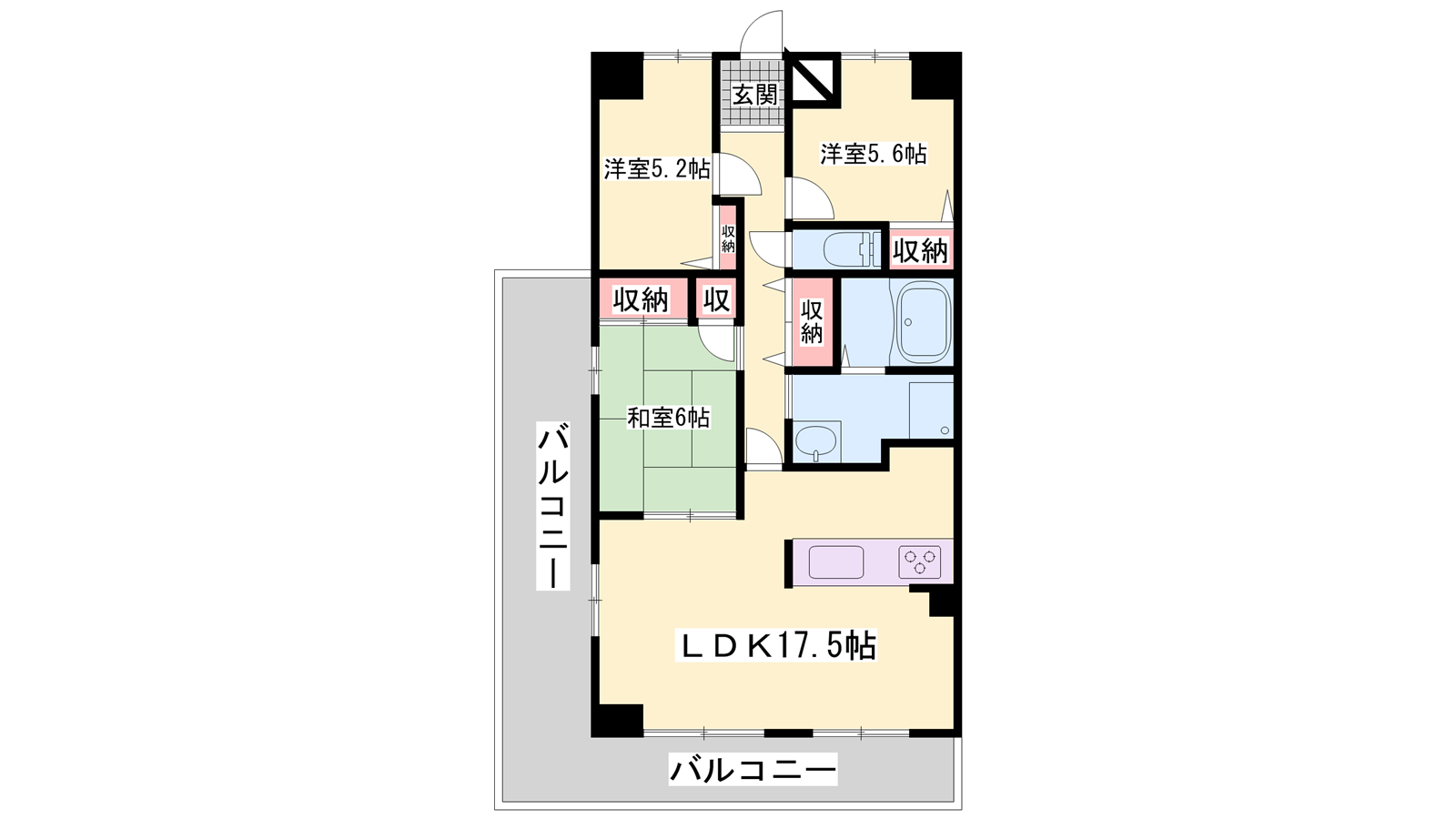 - LDK17.5帖、和室6帖、洋室5.6帖、洋室5.2帖