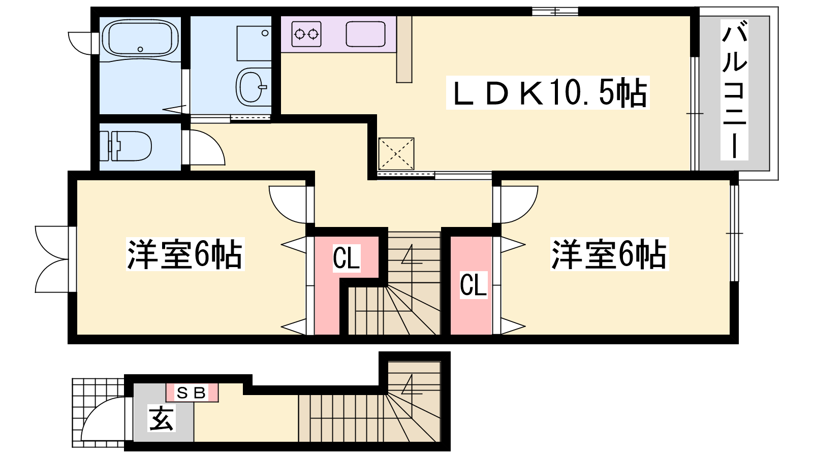 - LDK10.5帖、洋室6帖、洋室6帖