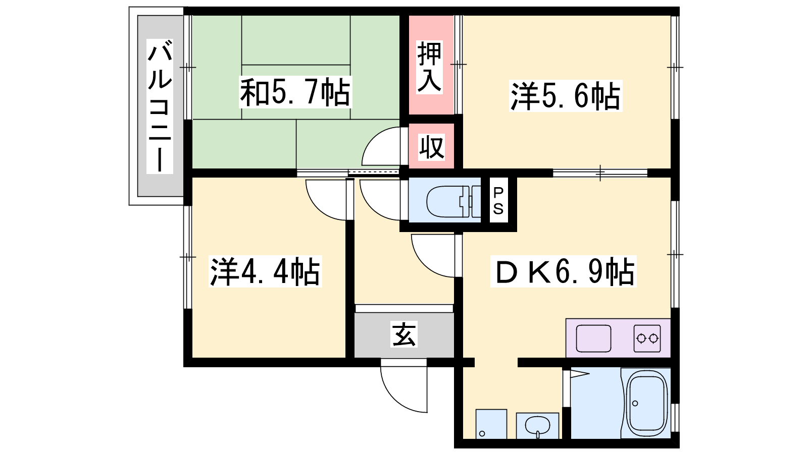 - DK6.9帖、洋室4.4帖、和室5.7帖、洋室5.6帖