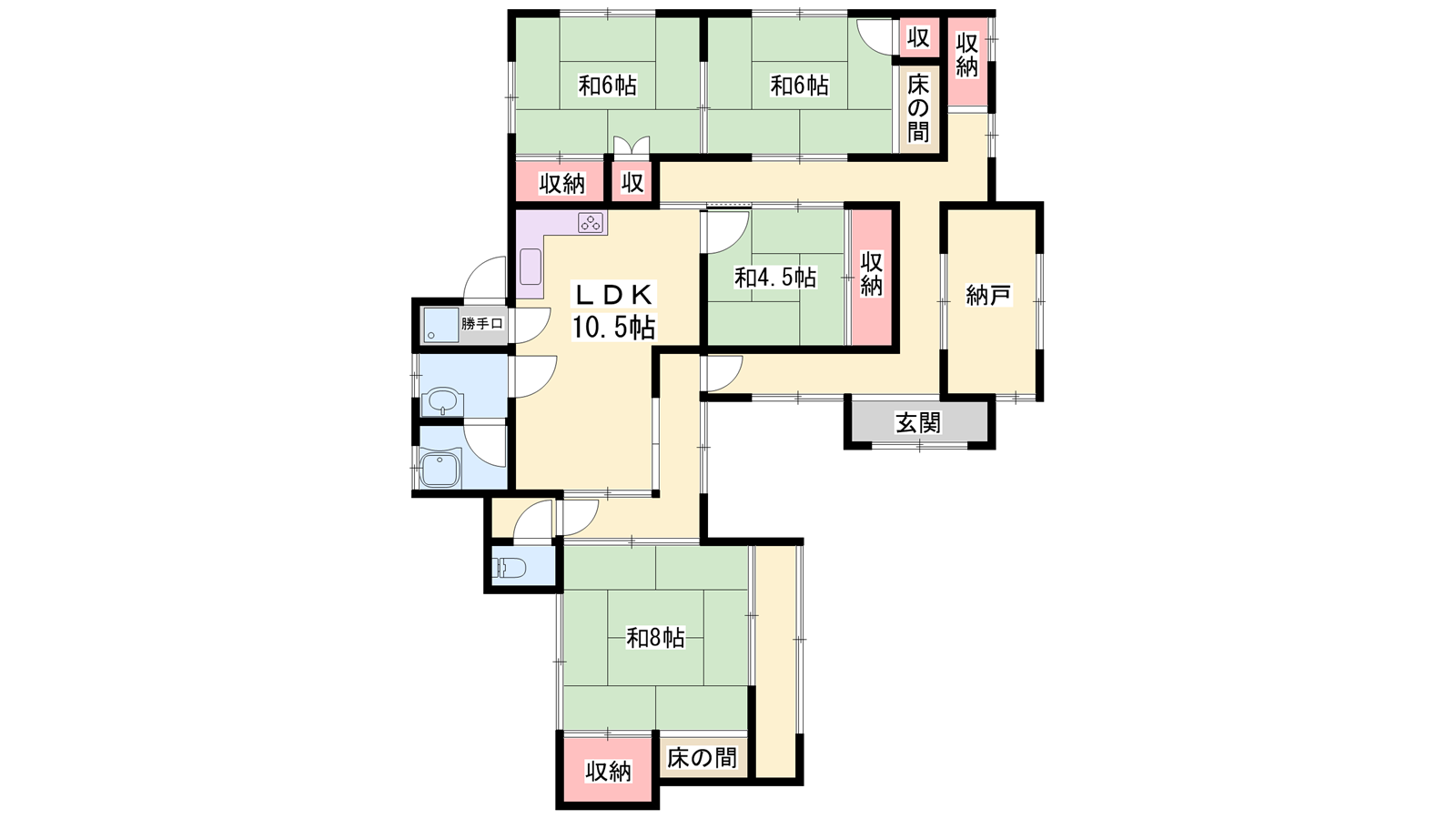 - LDK10.5帖、和室8帖、和室6帖、和室6帖、和室4.5帖