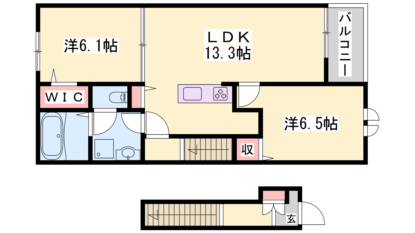 - LDK13.3帖、洋室6.5帖、洋室6.1帖