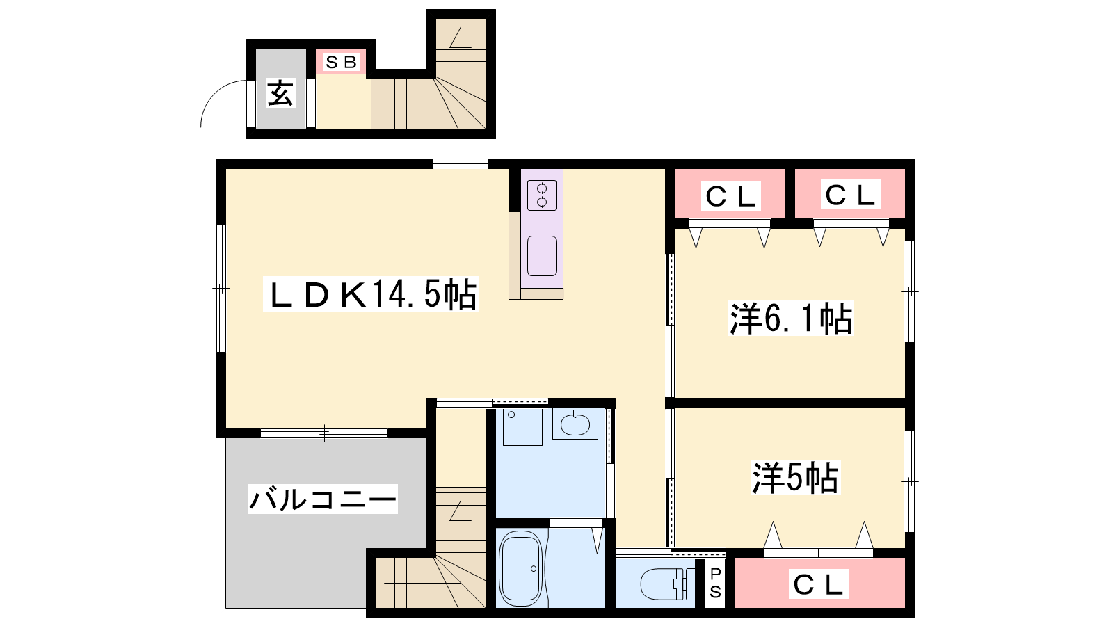 - LDK14.5帖、洋室6.1帖、洋室5帖