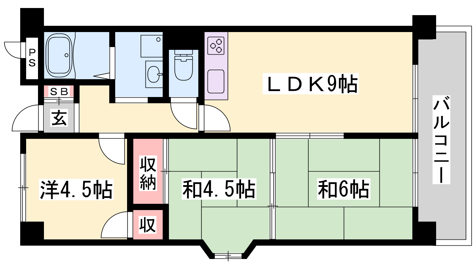 - LDK9帖、洋室4.5帖、和室6帖、和室4.5帖
