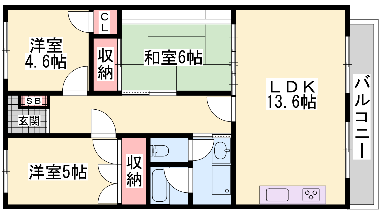 - LDK13.6帖、和室6帖、洋室5帖、洋室4.6帖