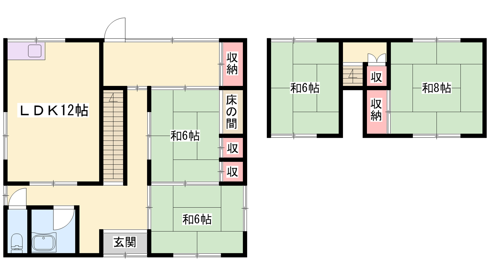 - LDK12帖、和室8帖、和室6帖、和室6帖、和室6帖