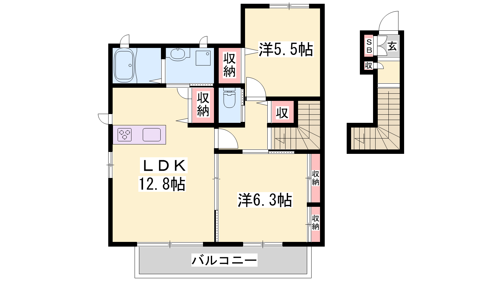 - LDK12.8帖、洋室6.3帖、洋室5.5帖