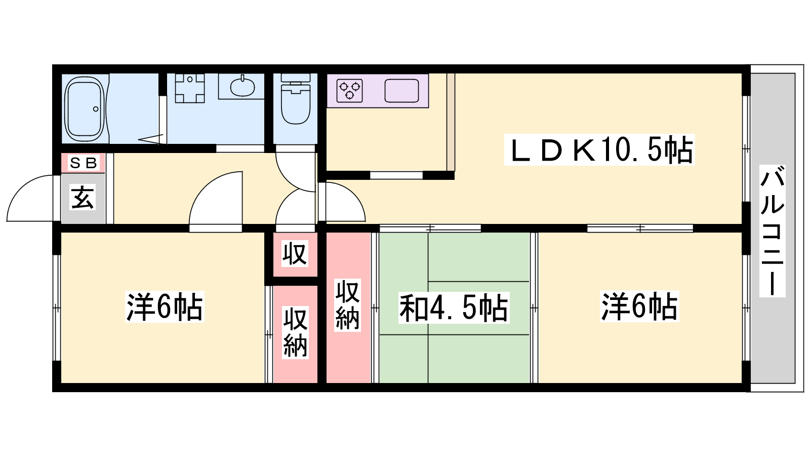 - LDK10.5帖、洋室6帖、洋室6帖、和室4.5帖