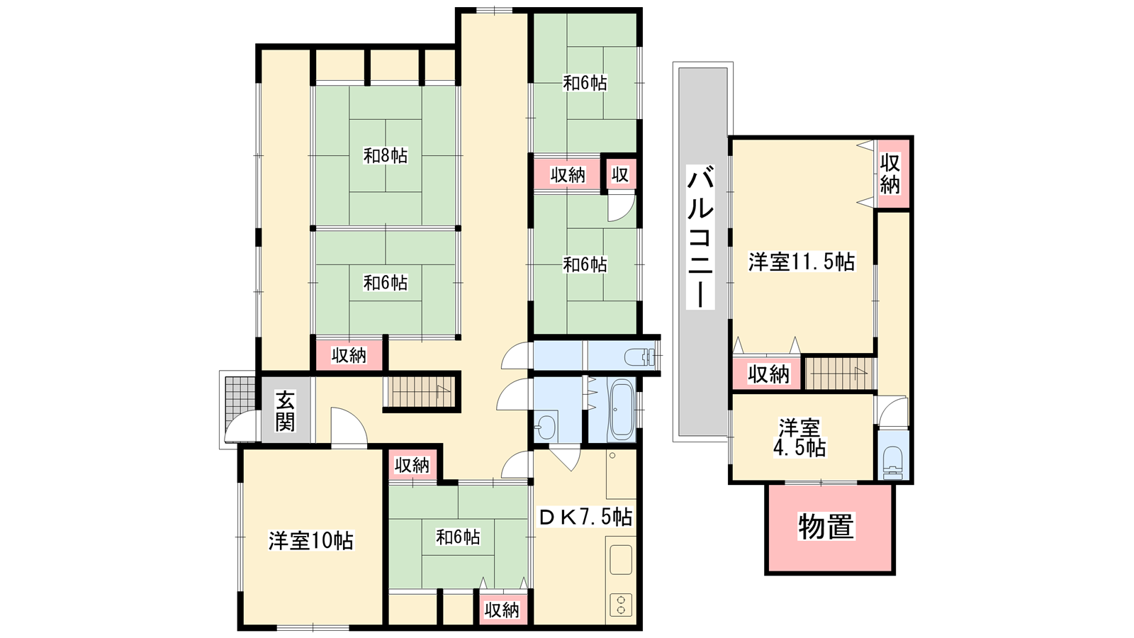 - 洋室11.5帖、洋室10帖、和室8帖、DK7.5帖、和室6帖、和室6帖、和室6帖、和室6帖、洋室4.5帖、S4帖