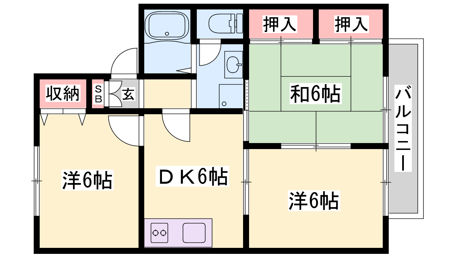 - DK6帖、洋室6帖、洋室6帖、和室6帖