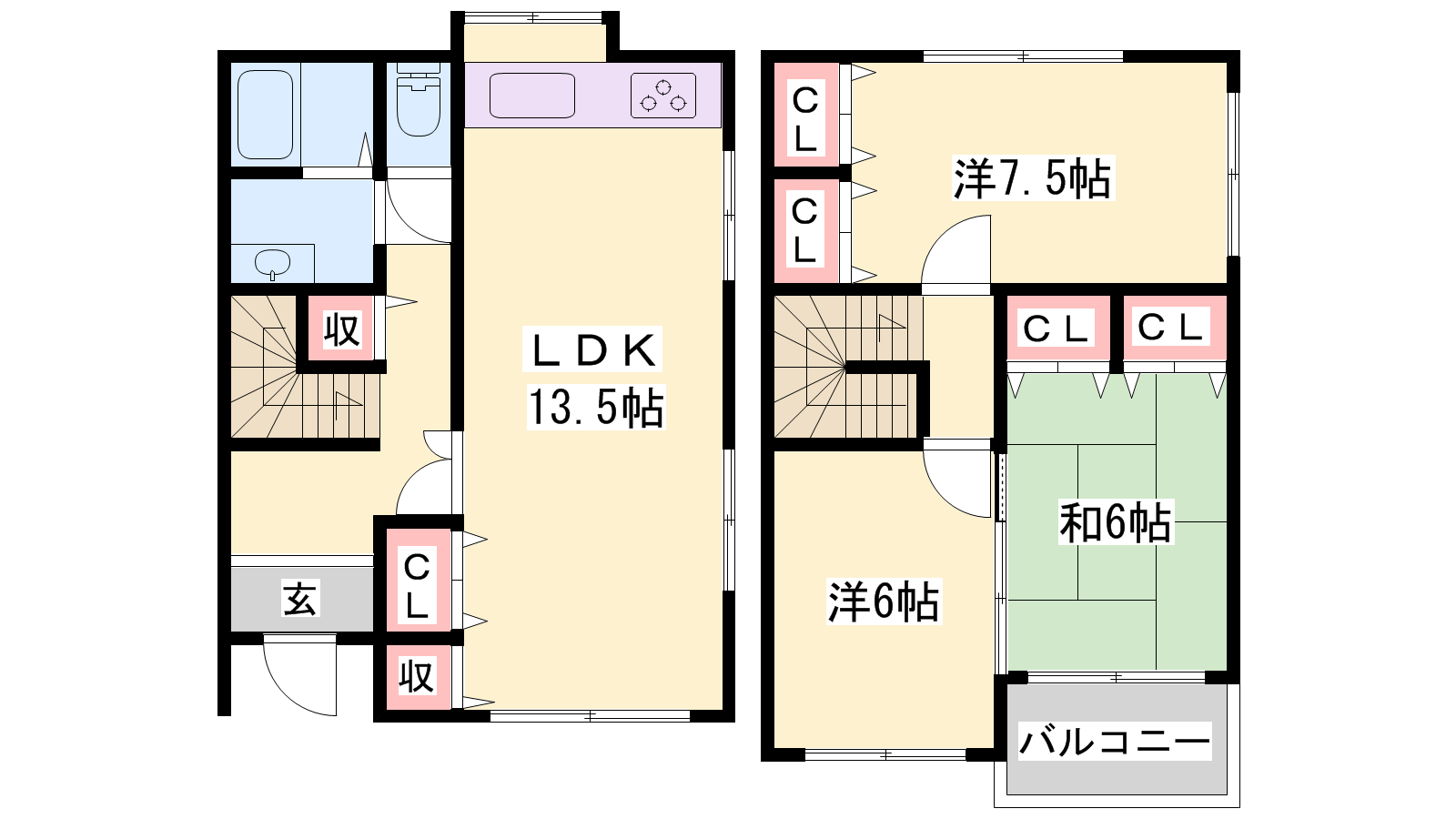 - LDK13.5帖、洋室7.5帖、洋室6帖、和室6帖