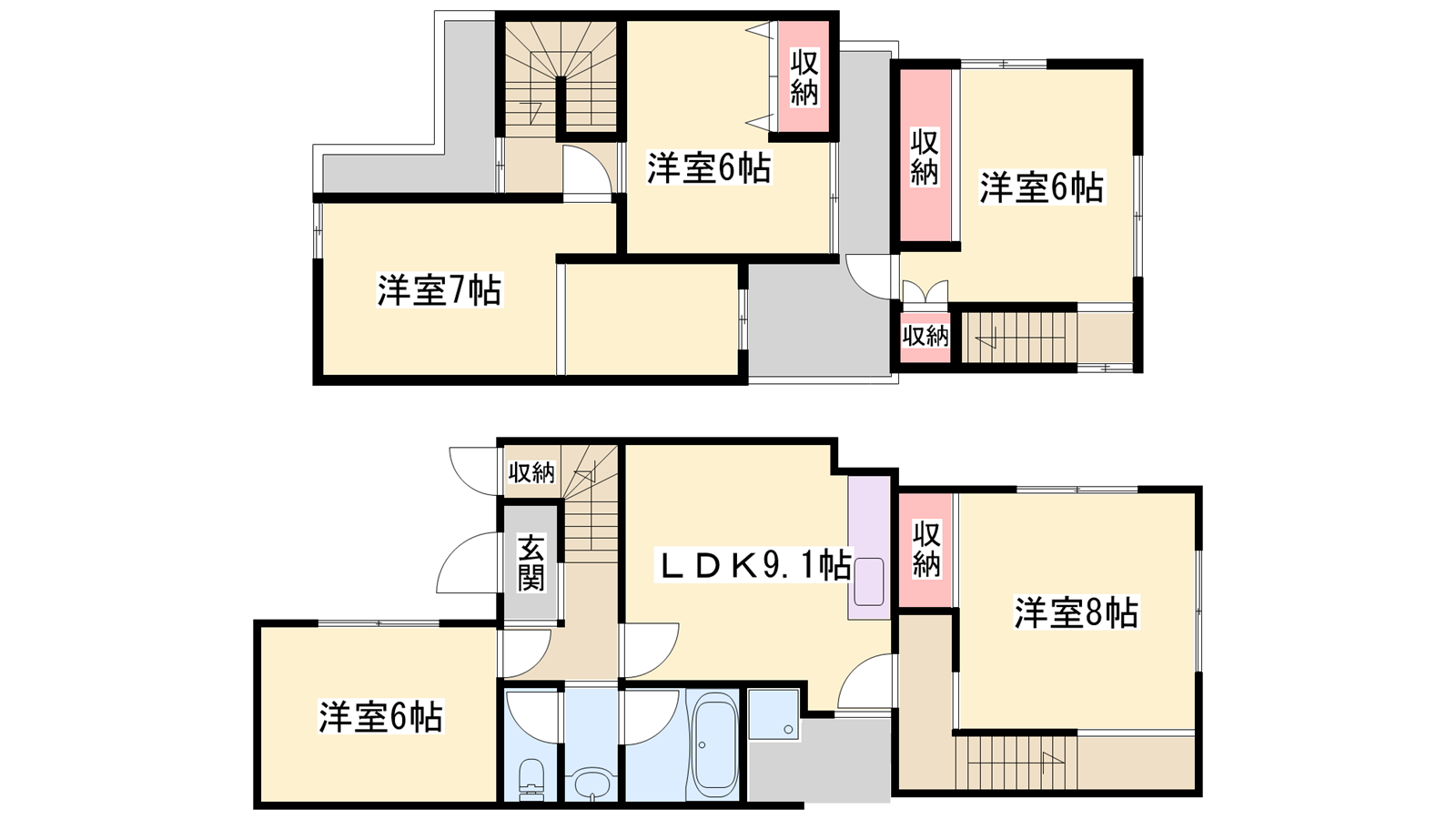 - LDK9.1帖、洋室8帖、洋室7帖、洋室6帖、洋室6帖、洋室6帖