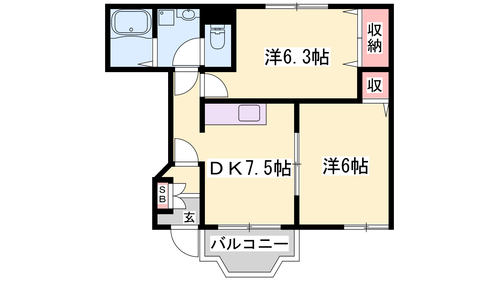 - DK7.5帖、洋室6.3帖、洋室3帖
