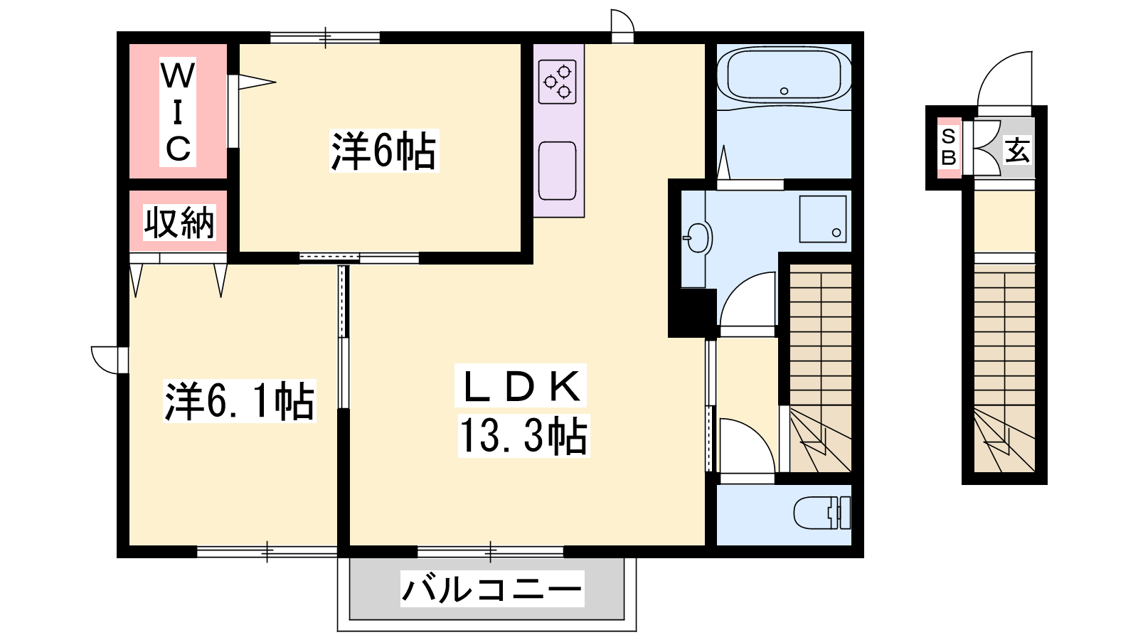 - LDK13.3帖、洋室6.1帖、洋室6帖