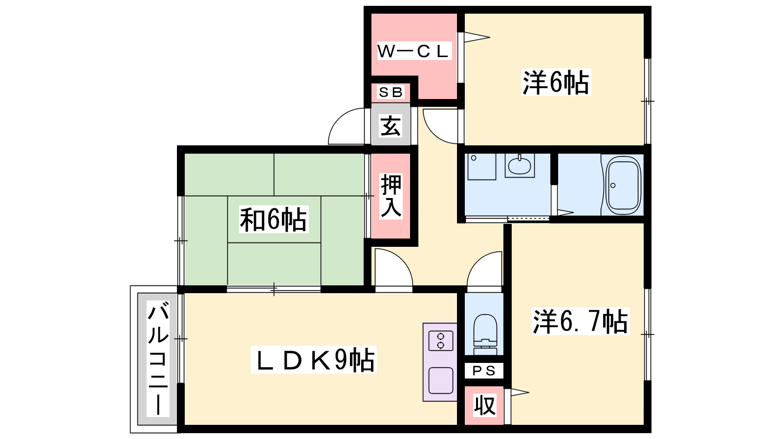- LDK9帖、洋室6.7帖、洋室6帖、和室6帖