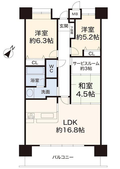 - LDK16.8帖、洋室6.3帖、洋室5.2帖、和室4.5帖