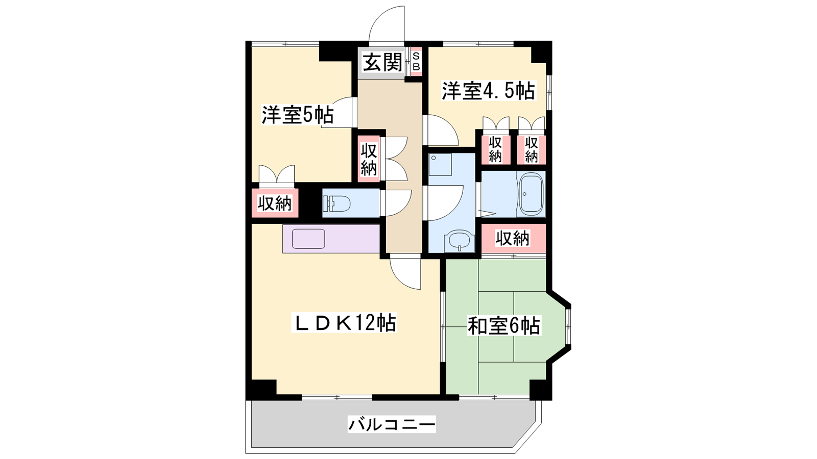 - LDK12帖、和室6帖、洋室5帖、洋室4.5帖