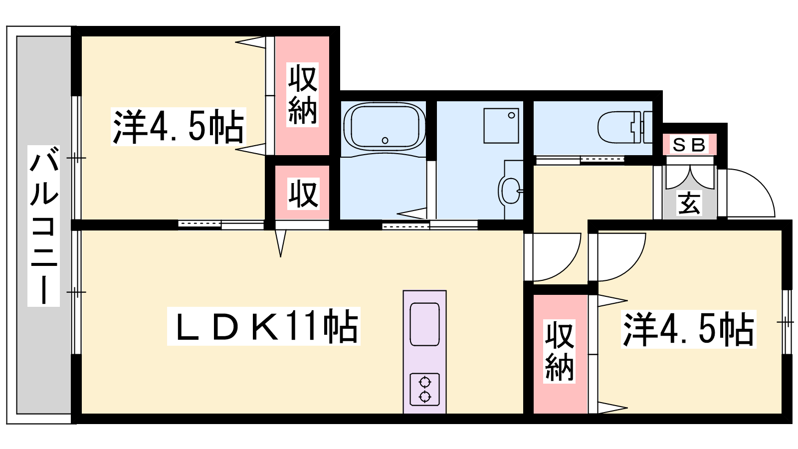 - LDK11帖、洋室4.5帖、洋室4.5帖