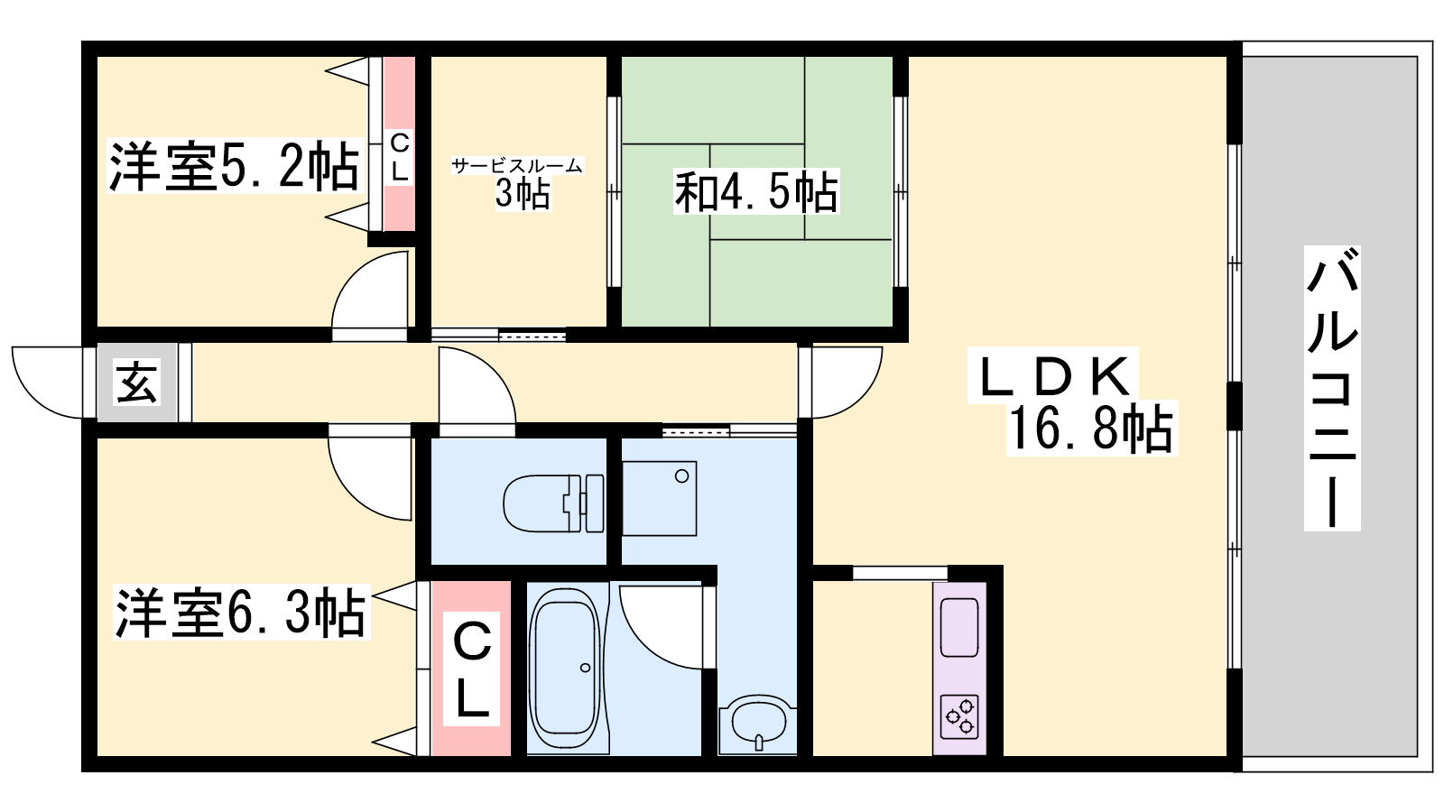 - LDK16.8帖、洋室6.3帖、洋室5.2帖、和室4.5帖