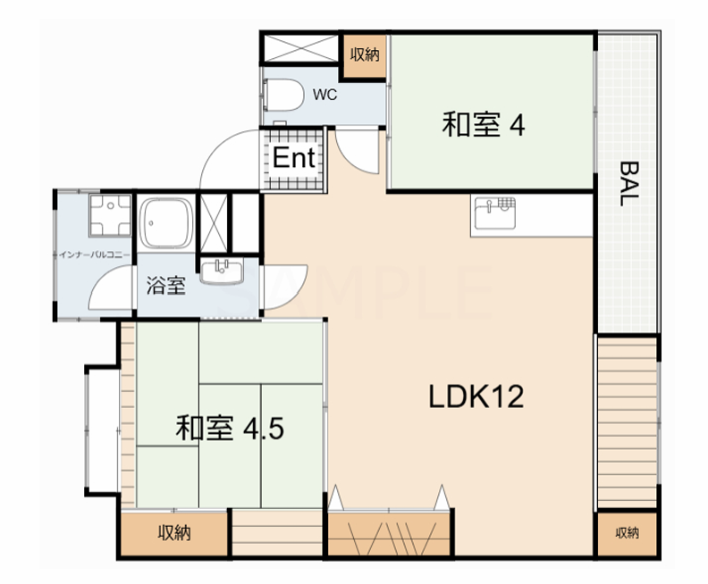 - LDK12帖、洋室4帖、和室4.5帖