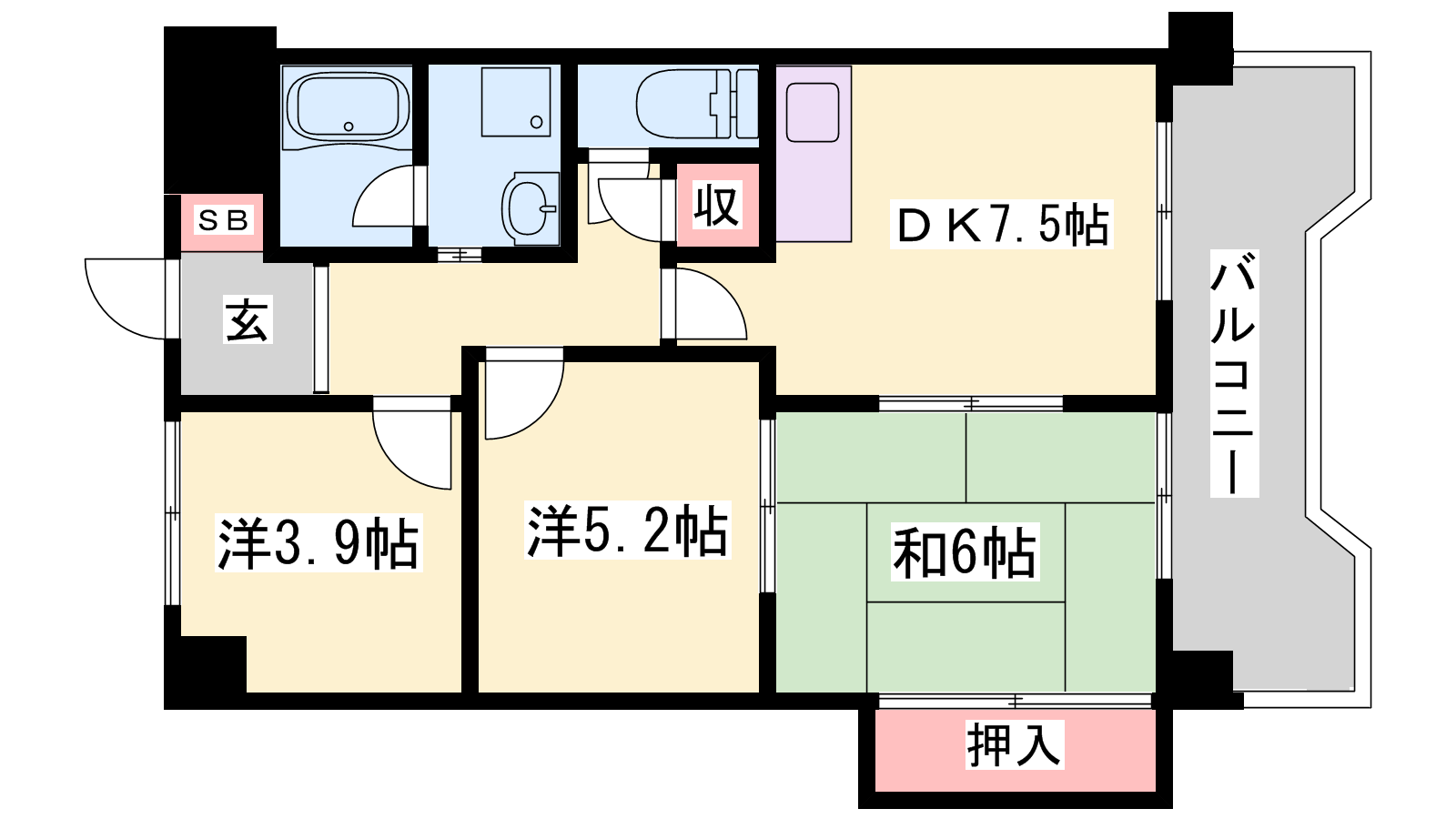 - DK7.5帖、和室6帖、洋室5.2帖、洋室3.9帖