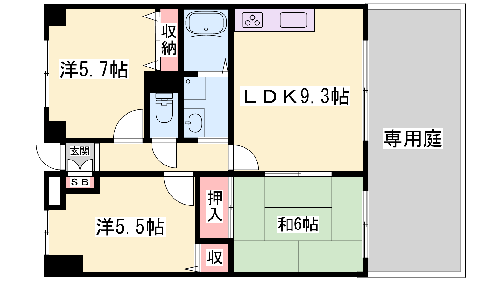 - LDK9.3帖、洋室5.7帖、洋室5.5帖、和室6帖