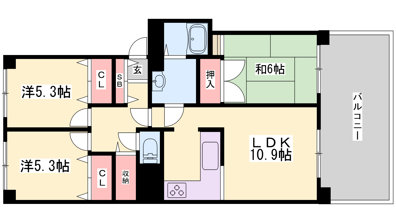- LDK10.9帖、洋室5.3帖、洋室5.3帖、和室6帖