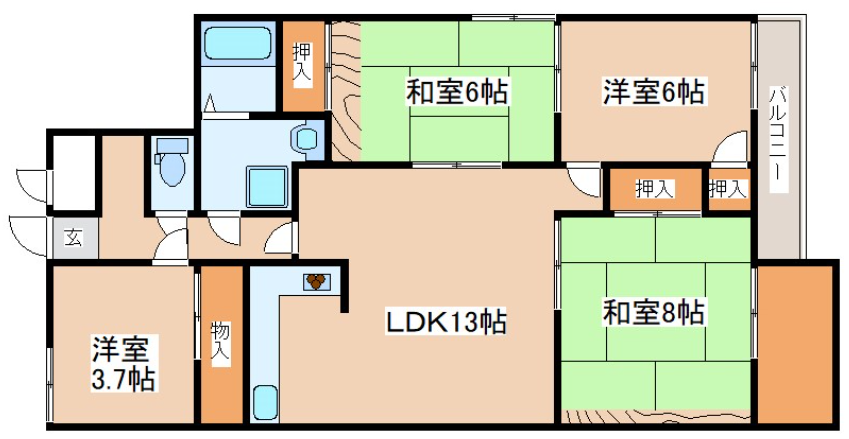 - LDK13帖、洋室6帖、洋室3.7帖、和室6帖、和室6帖
