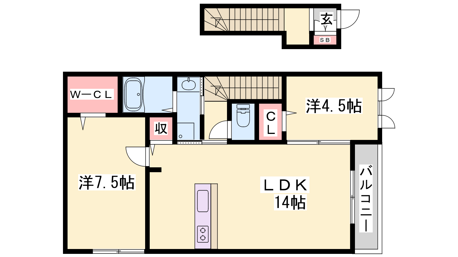 - LDK14帖、洋室7.5帖、洋室4.5帖