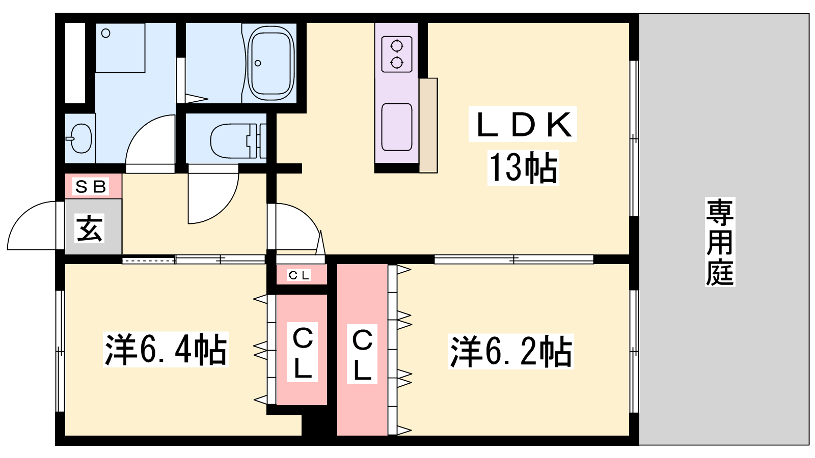 - LDK13帖、洋室6.4帖、洋室6.2帖